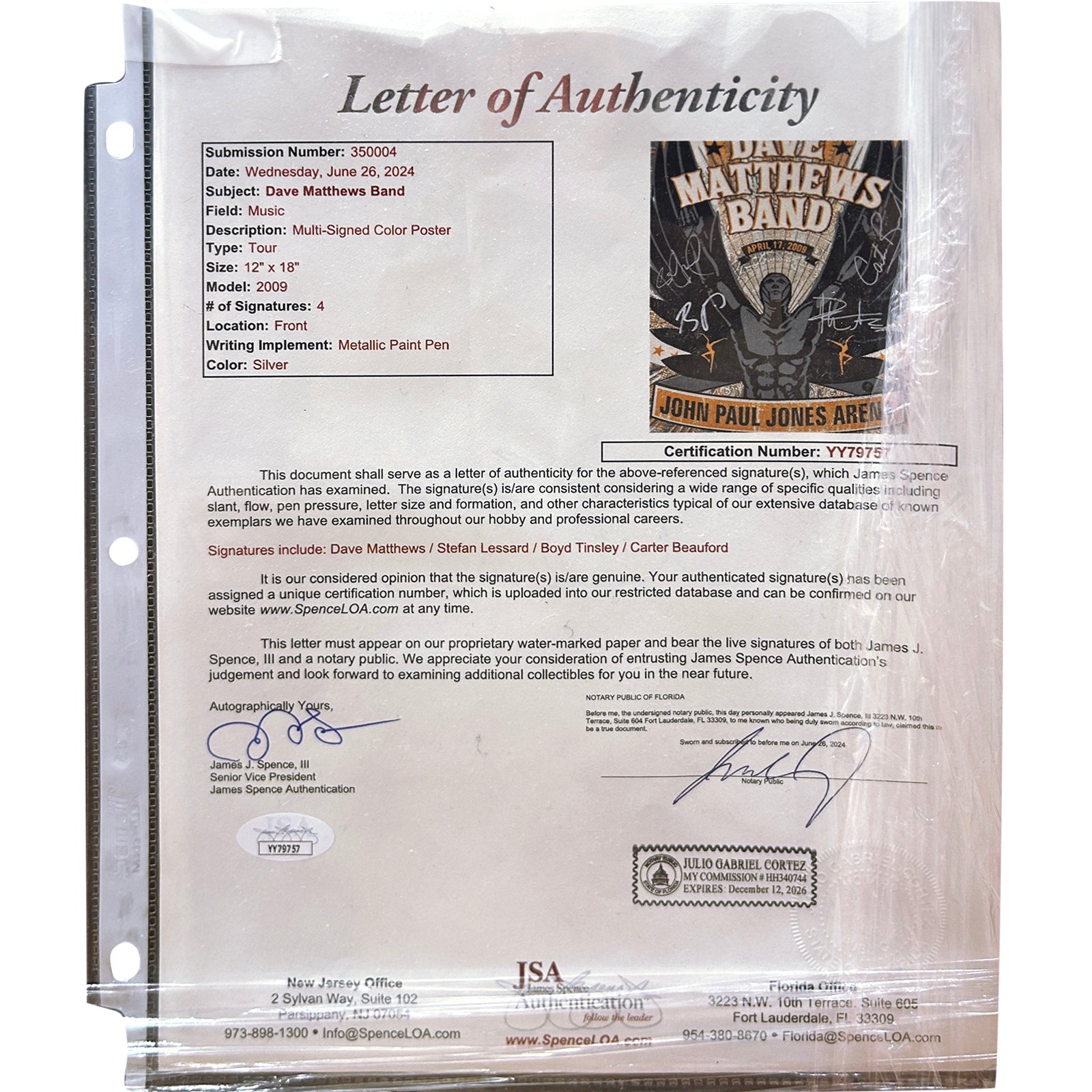 - Signatures: Dave Matthews, Stefan Lessard, Boyd Tinsley, and Carter Beauford