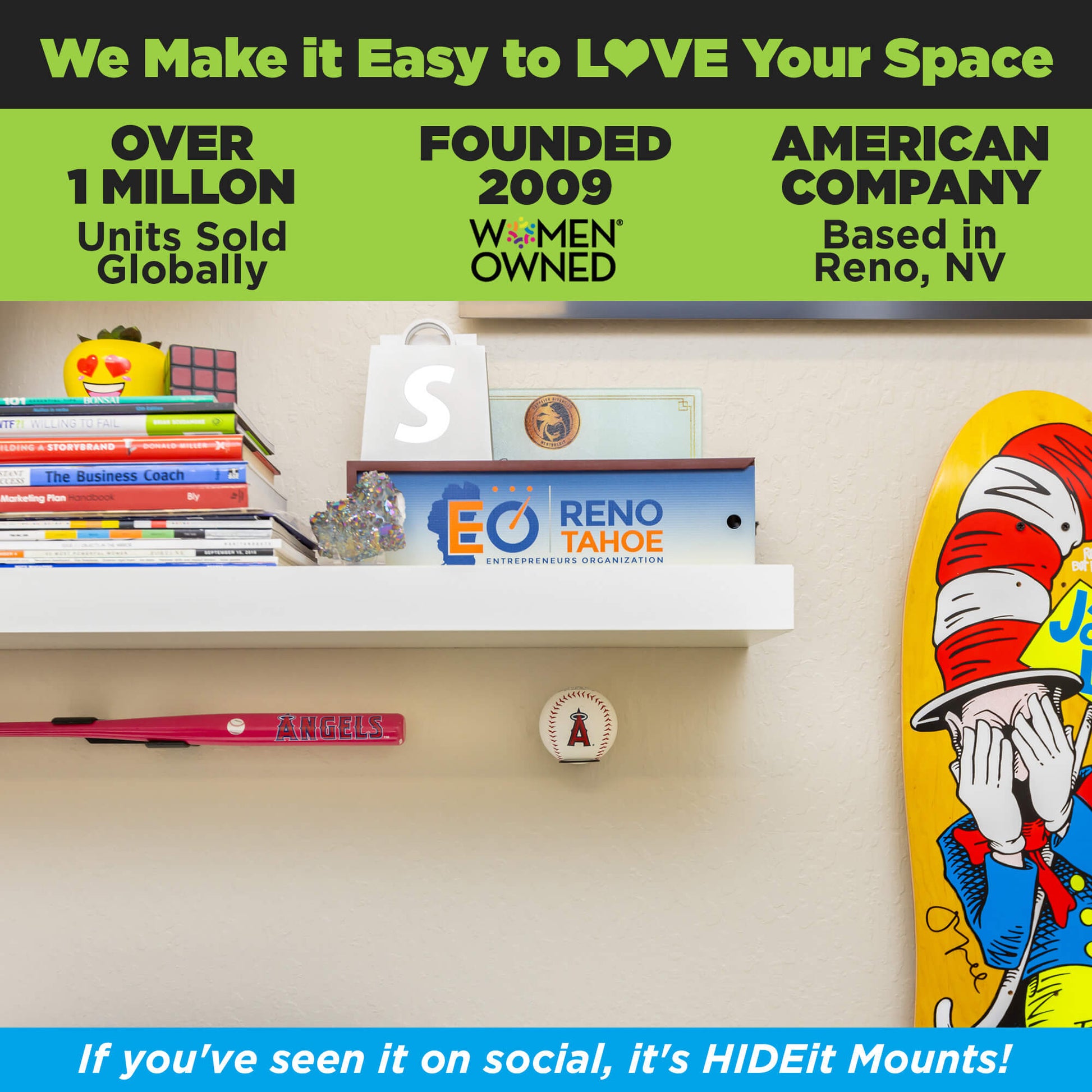 The HIDEit Small Ball Mount is designed with baseballs in mind. This steel mount displays your favorite baseball + the minimal design gives it a free-floating look. With this baseball wall mount, display your game ball, team-signed ball, or first home run ball. This small ball wall mount is quick and easy to install, perfect for creating an epic baseball wall display. Plus, it can hold 2-3" balls— lacrosse, tennis + more!