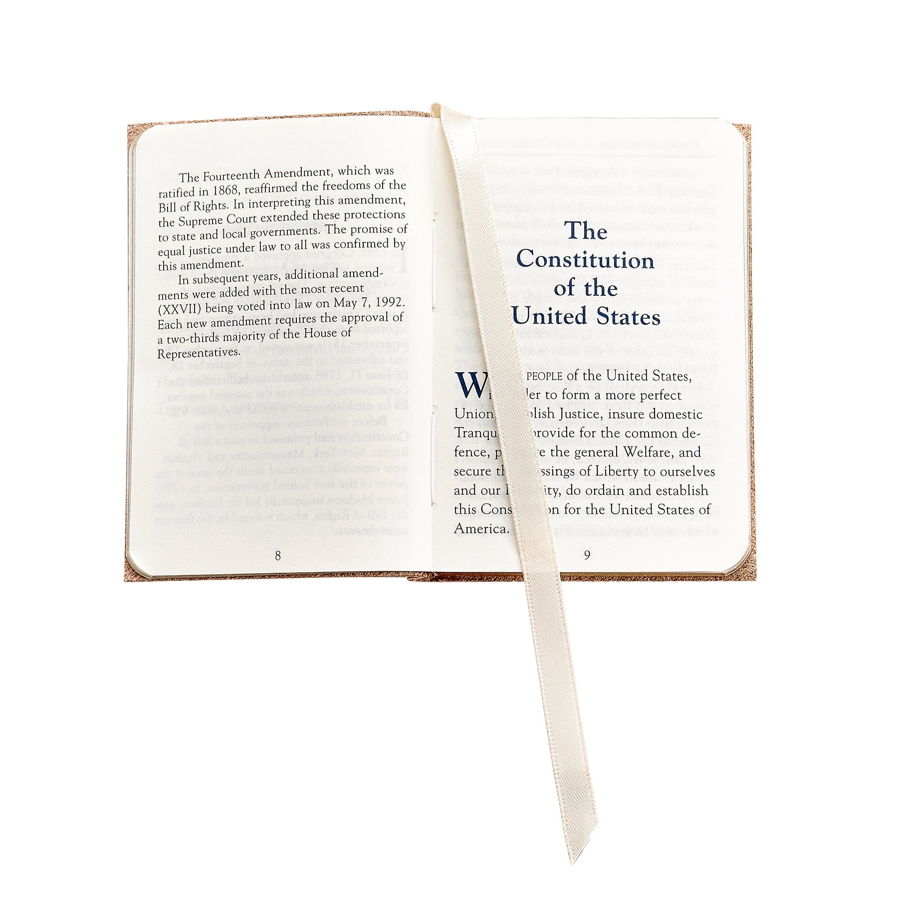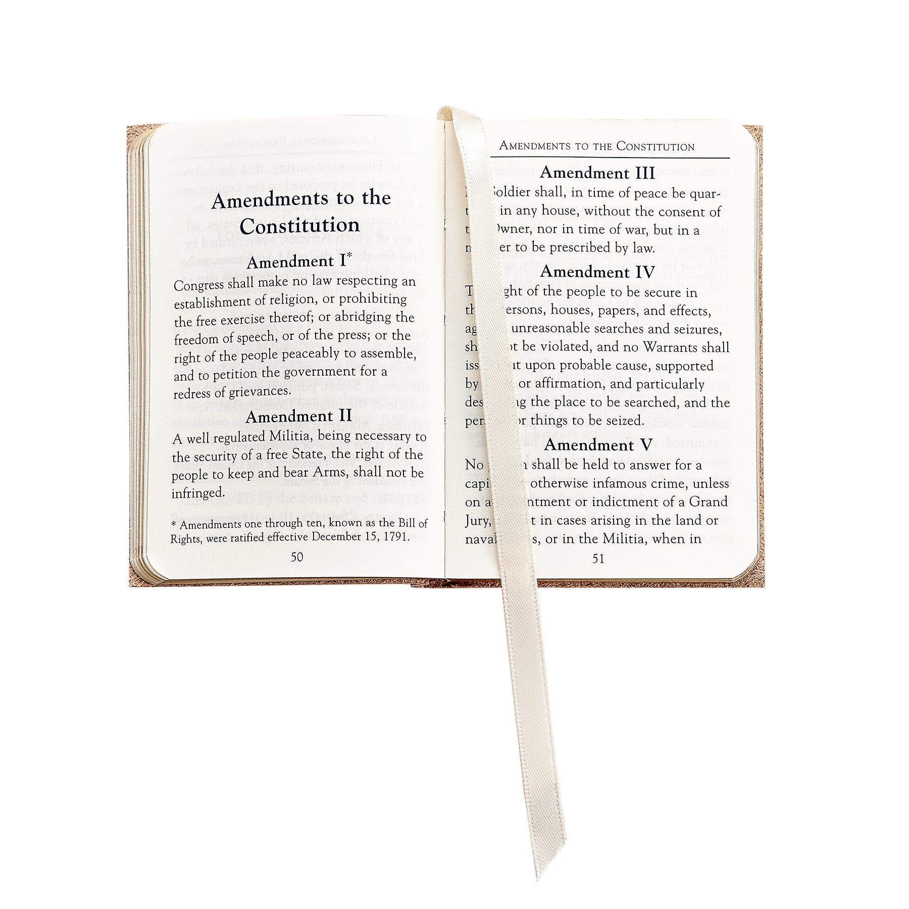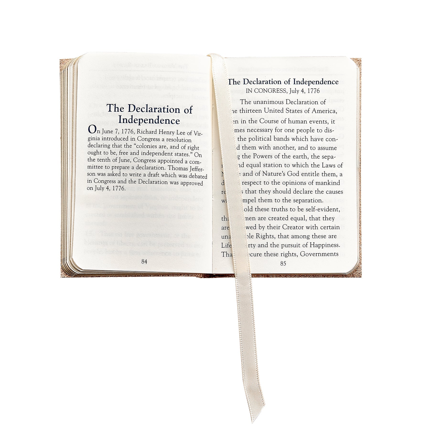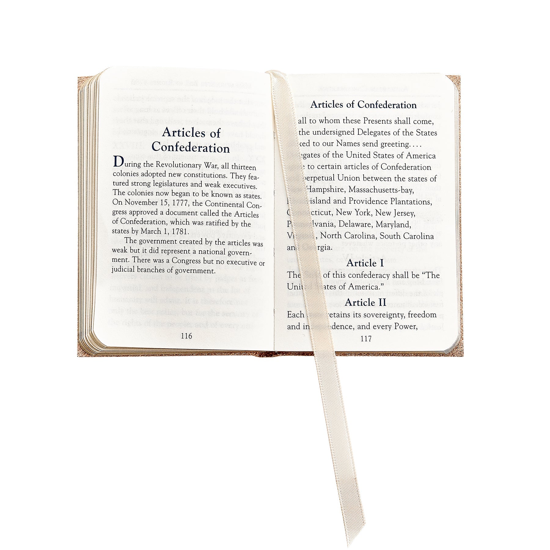 Our nation's history fits neatly in the palm of your hand. This palm sized leather bound book is a 192 page edition containing the complete United States Constitution, the Bill of Rights, and every constitutional amendment to the present day. Also included is an impressive array of documents, revealing the ideas, aspirations and differing views of the founding fathers.
