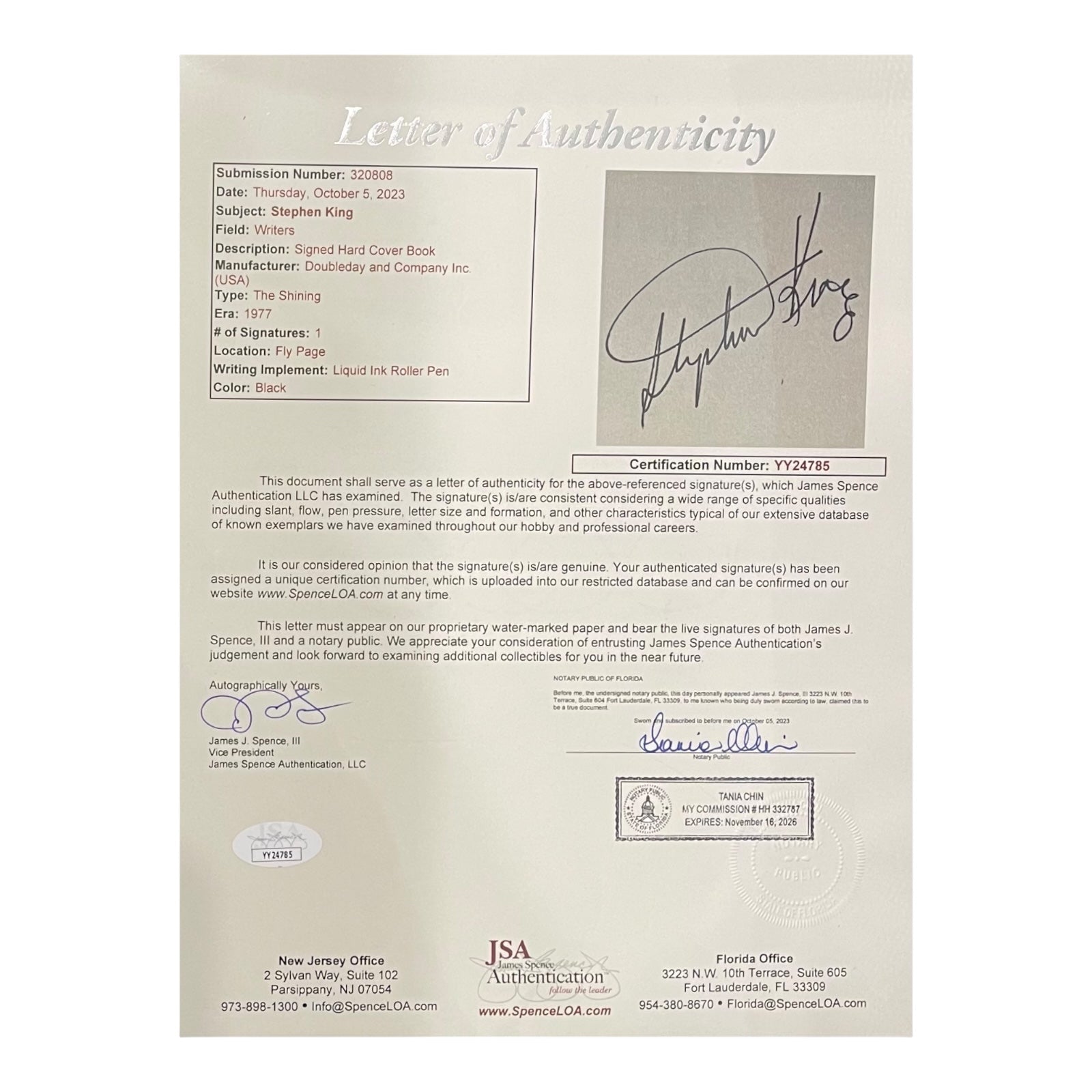This copy of The Shining was hand signed by author Stephen King. It is accompanied by a Certificate of Authenticity from JSA. A tamper-evident hologram will be affixed to the item. Each signature is witnessed by a member of our staff or comes out of a private signing.