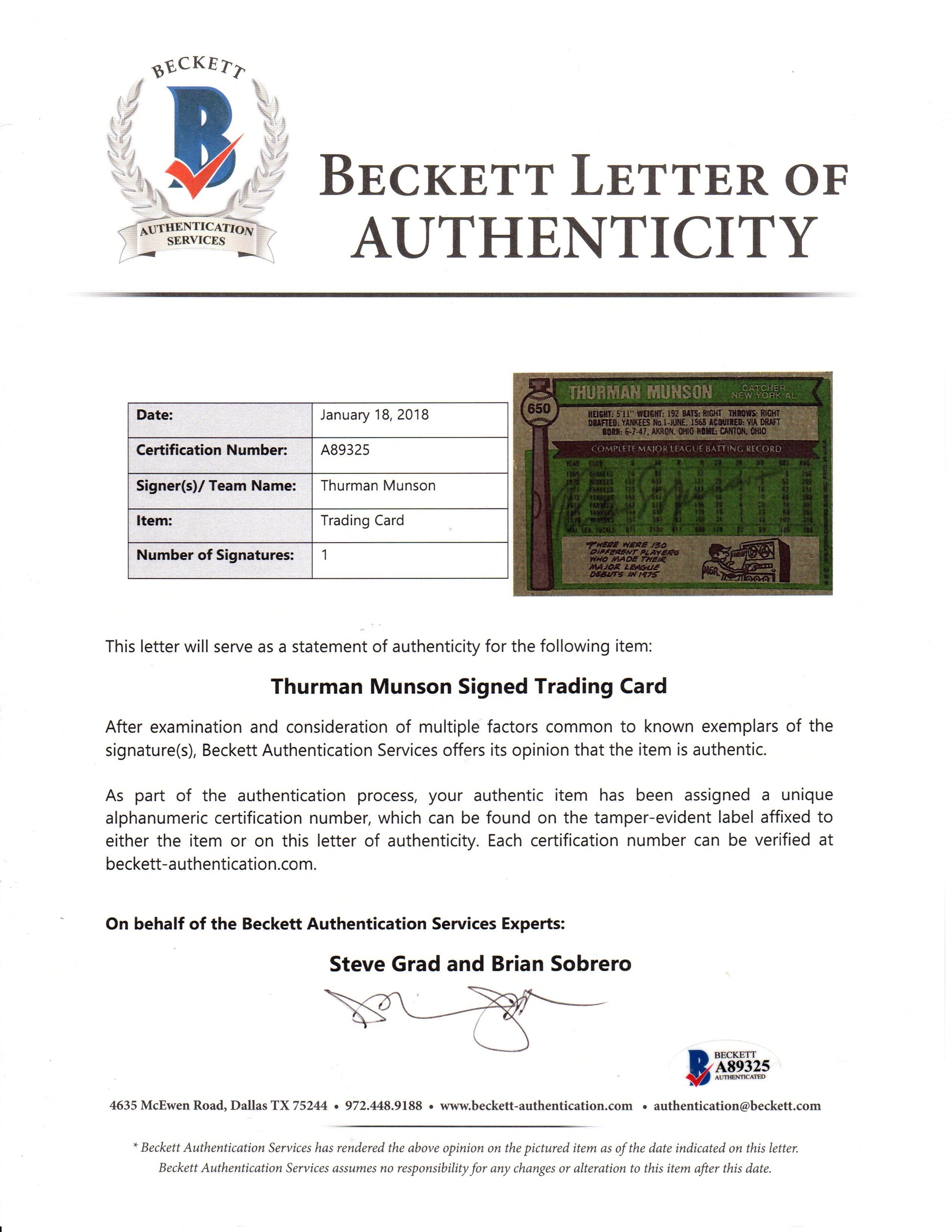 Thurman Munson Autographed 1976 Topps #650 New York Yankees Card - Beckett LOA A89325