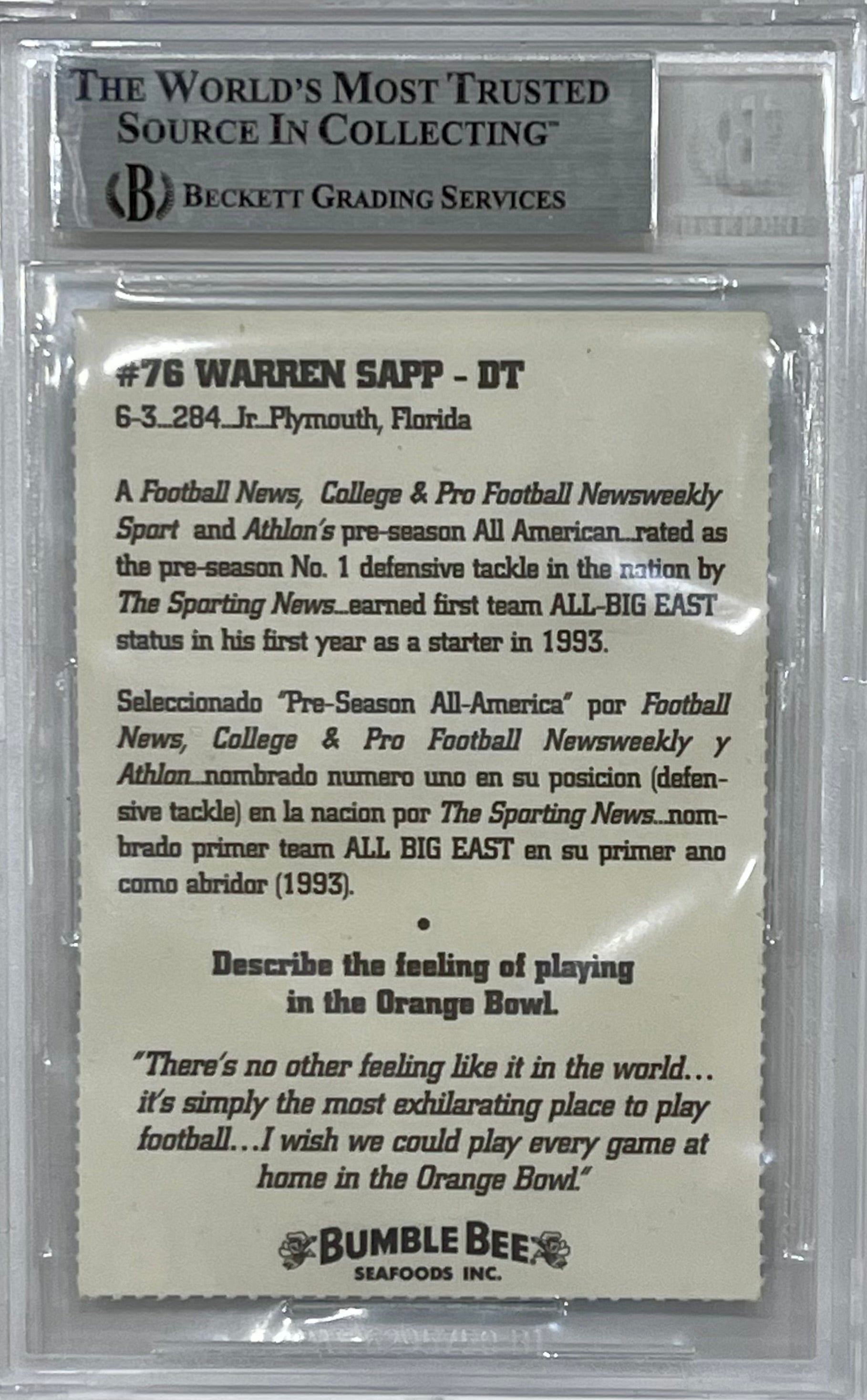 Autographed Warren Sapp 1994 Miami Hurricanes Bumble Bee Card
